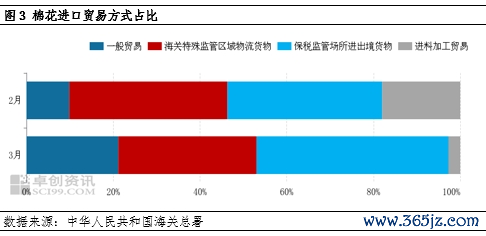 从棉花进口贸易方式来看,3月份通过进料加工贸易方式进口棉花数量占比较2月份明显下降,一般贸易与保税监管场所进出境货物进口占比有所增加。具体来看,3月份保税监管场所进出境货物、海关特殊监管区域物流货物、一般贸易及进料加工贸易占比分别为:44.27%、31.83%、21.16%、2.74%。部分外贸出口企业订单已缩减的影响,或已在棉花进口通过来料加工贸易方式中开始体现。