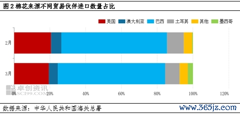 美国对中国及其他棉花消费国加征关税,使得全球棉纺织市场稳定性受到冲击,同时也引起其他纺织消费国之间贸易无法正常进行,由此导致整个行业商品流通传导阻力加大。从3月份棉花进口来源数量看,美棉、巴西棉、澳棉进口数量较2月份分别减少39.82%、35.14%、44.85%。美棉性价比优势不足,加之关税提高,占3月总进口量比例为19.46%,而巴西棉占比已达到59.98%。