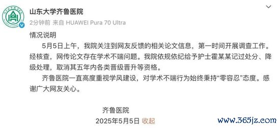 5月5日,山东大学齐鲁医院一名护士论文中被曝出现“男性患子宫肌瘤”,引发热议。5月5日下午,山东大学齐鲁医院官方微信公众号发布通报:我院关注到网友反馈的相关论文信息国内最靠谱的配资公司,第一时间开展调查工作。经核查,网传论文存在学术不端问题。我院依规依纪给予护士霍某某记过处分、降级处理,取消其五年内各类晋级晋升等资格。齐鲁医院一直高度重视学风建设,对学术不端行为始终秉持“零容忍”态度。感谢广大网友关心。