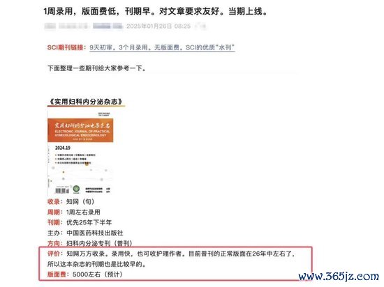 极目新闻记者也注意到,在今年1月,网上有论文代发机构推荐《实用妇科内分泌电子杂志》,称一周左右录用。对该期刊的评价为:“知网万方收录。录用快,也可收护理作者。版面费预计5000左右。”