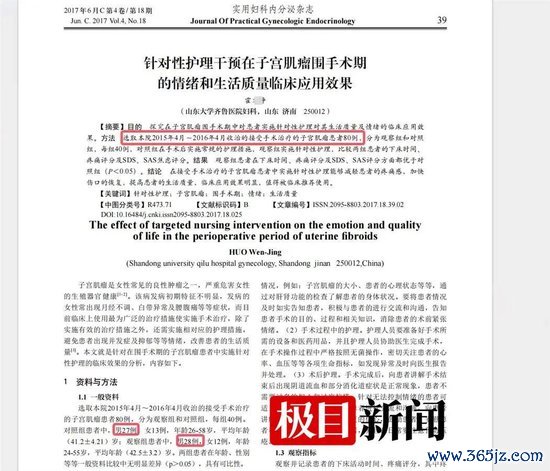 引发争议的论文题为《针对性护理干预在子宫肌瘤围手术期的情绪和生活质量临床应用效果》,作者系山东大学齐鲁医院妇科护士,文章发表在《实用妇科内分泌杂志(电子版)》。